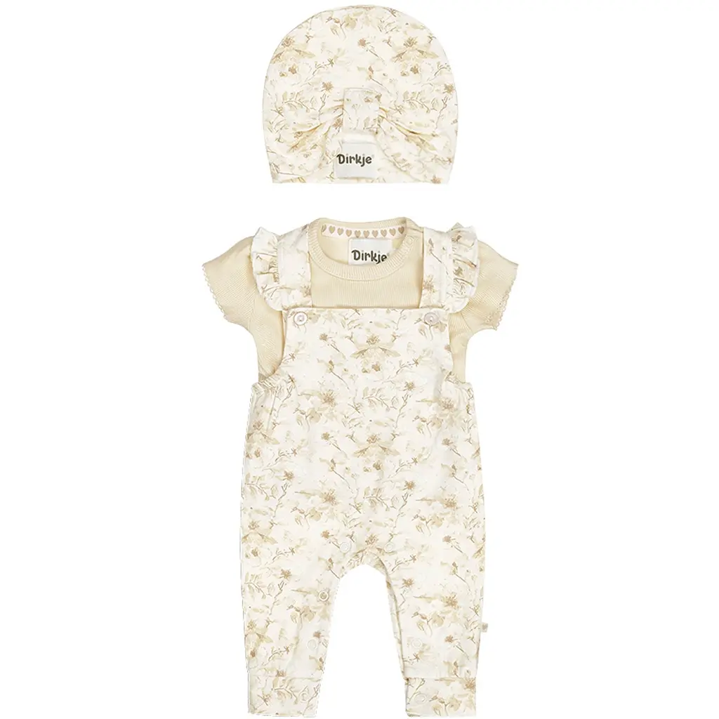 Driedelig setje (off-white) - mutsje; t-shirtje en tuinbroekje